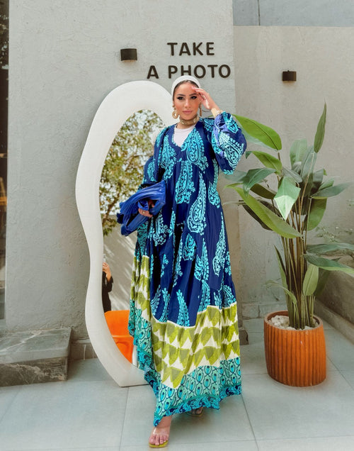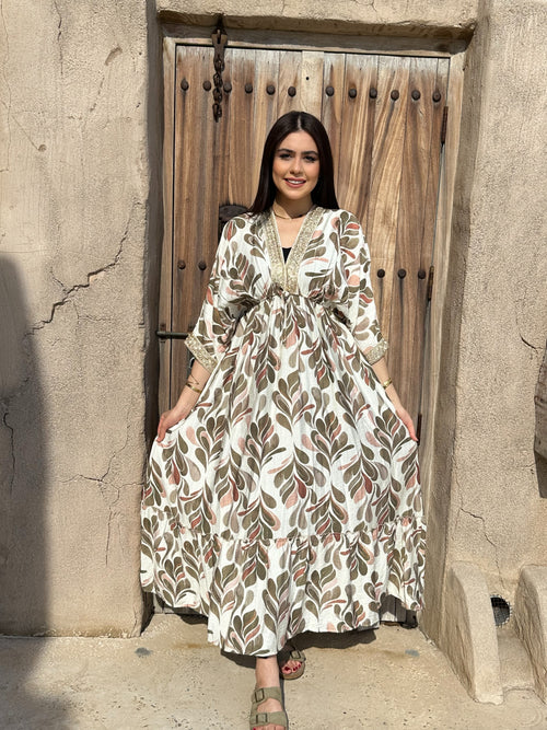 تألقي بحضور استثنائي يجمع بين الرقي والراحة مع هذه العباية المفتوحة من MM Boutique. صُممت هذه القطعة بعناية من خامة الكتان العملي باللون الأسود الملكي، لتكون لوحة فنية تتزين بخطوط ذهبية طولية تمنح قوامك مظهراً ممشوقاً. وتكتمل الفخامة بالتطريز الهندسي الذهبي الكثيف على الأطراف السفلية، مما يجعلها تحفة فنية تلفت الأنظار في كل خطوة.